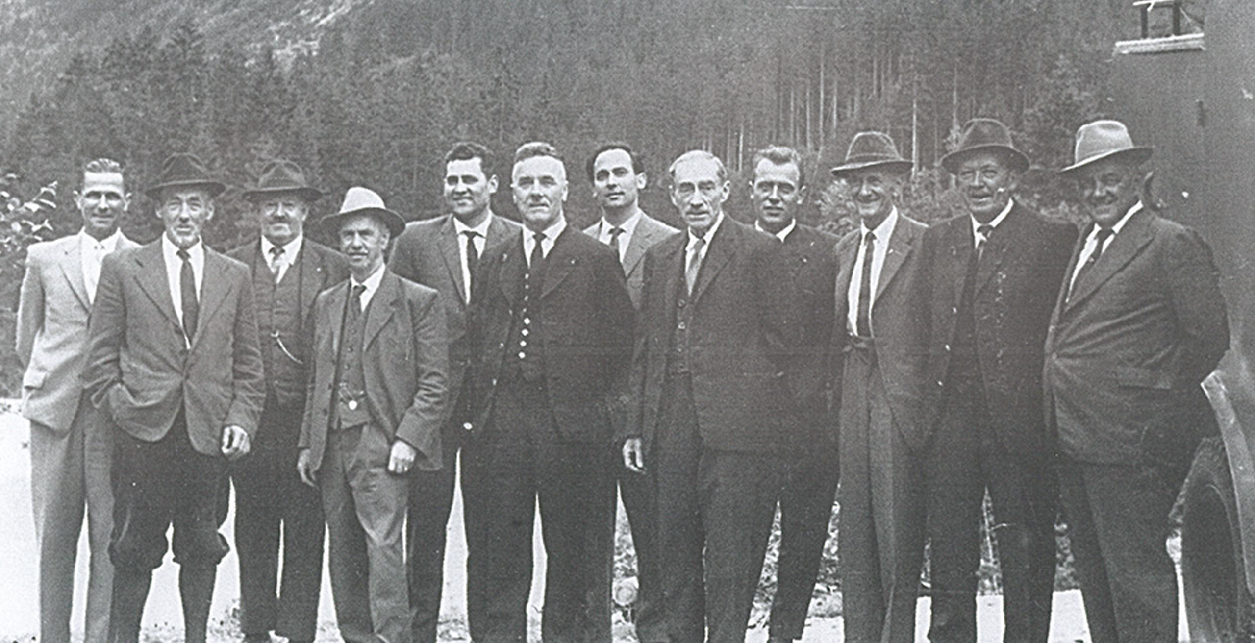 Bild: stehend v.l.: Josef Eichinger, Rudolf Uhrmann, August Hörhager, Johann Steiner, Johann Bräuer, Pius Ensmann; sitzend v.l.: Alois Gruber, Pfarrer Mathias Göllner, Josef Zwicknagel (Obm), Raimund Zingerle, Anton Lemberger, Anton Hochreiter